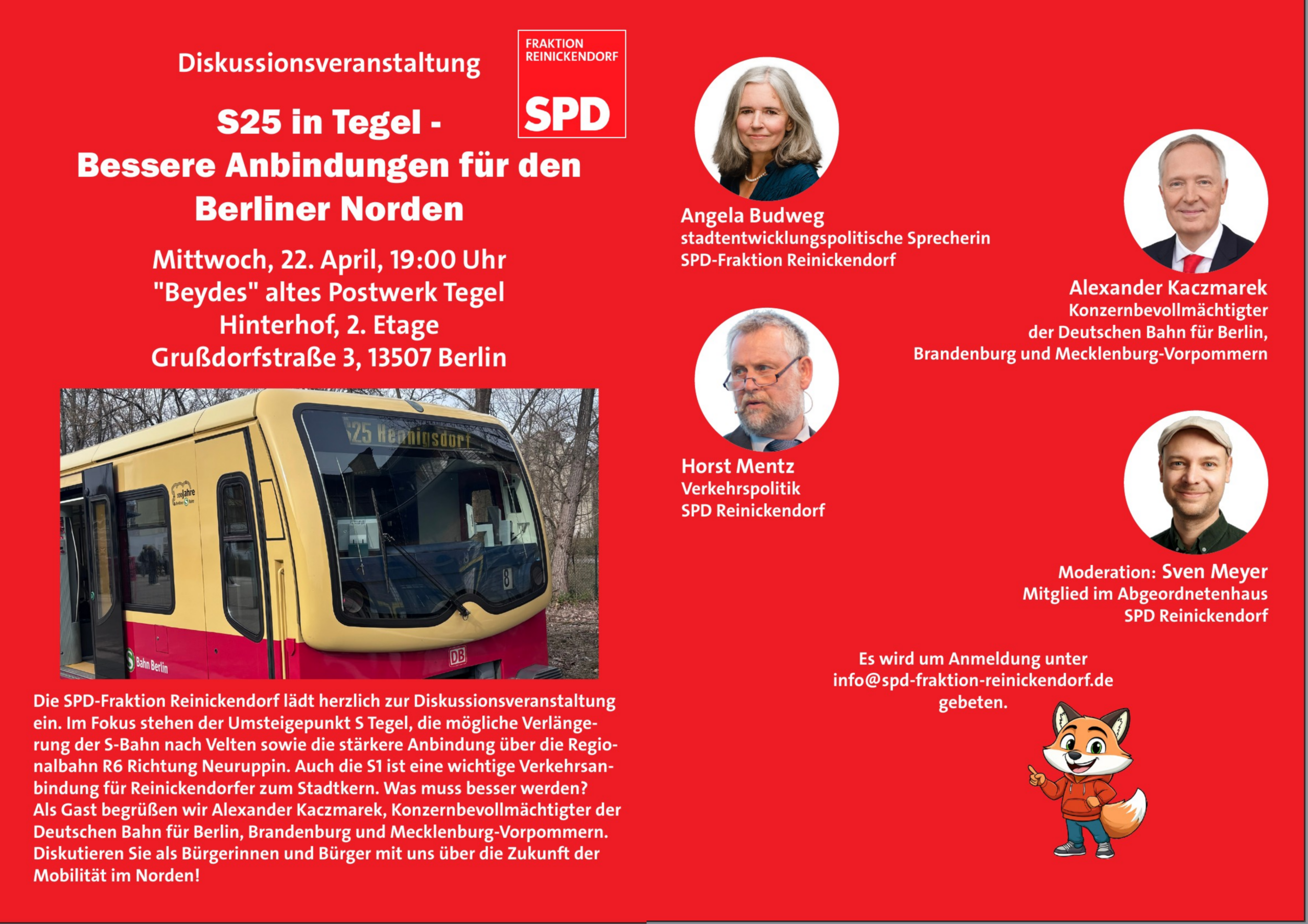 S25 – Bessere Anbindung für den Berliner Norden April 6, 2026 Termin Details Datum: April 22, 2026 19:00 – 21:00 Ort: Beydes altes Postwerk Tegel Share on FacebookPost on XFollow us
